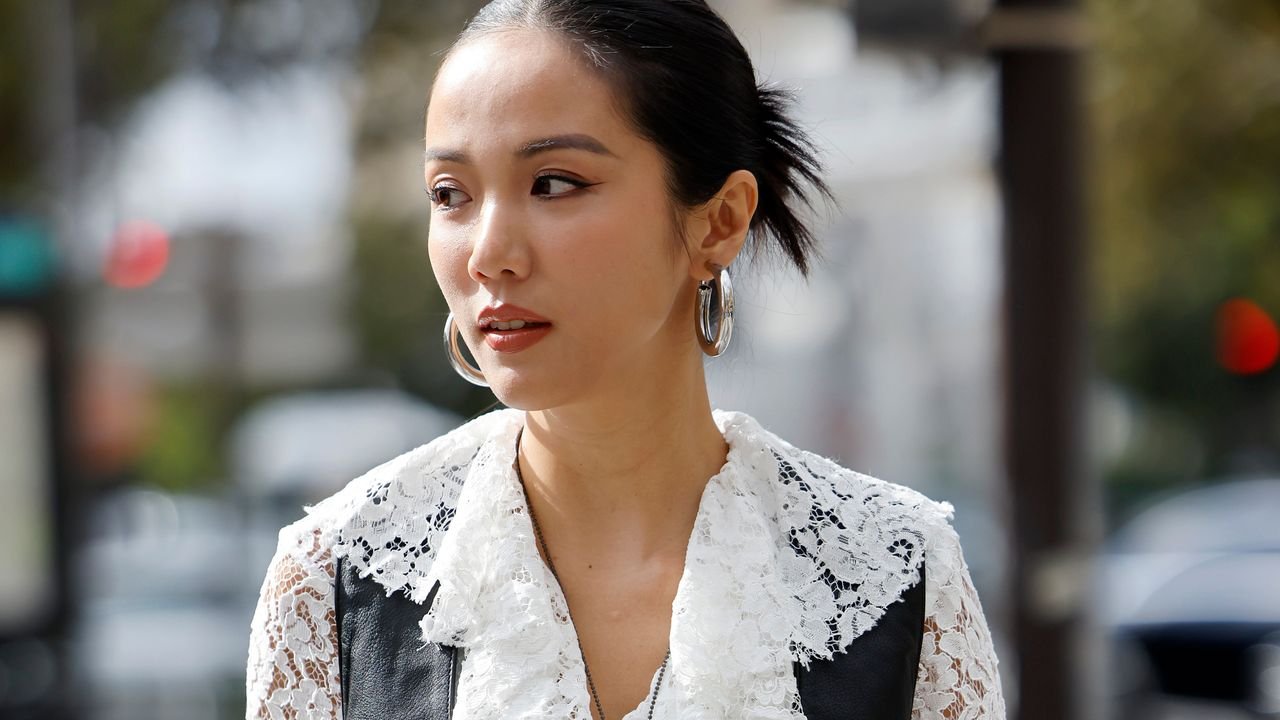 Blusa larga con capa, accesorios plateados y jeans rectos en street style, verano 2023.Christian Vierig / Getty Images