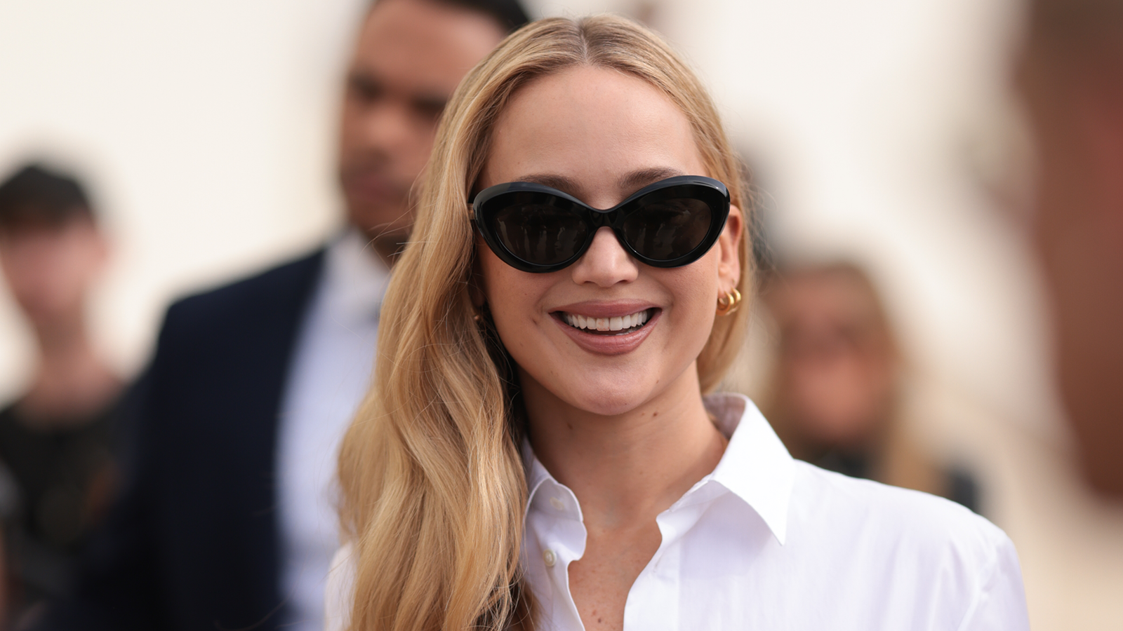 To finish, Lawrence accessorized with a black tote bag and matching sunglasses, plus her signature gold necklace stack.
