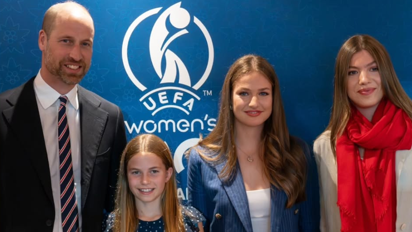 Prince William, Princess Charlotte, Princess Leonor and Infanta Sofia posing at the Women's European soccer championship