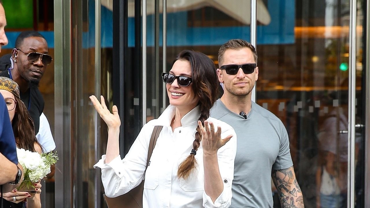 The actor and Vogue cover star was photographed leaving The Devil Wears Prada 2 set in a distinctly Anne outfit. She wore a relaxed white denim jumpsuit, rolled up to the ankle and wrists, with a low waist and popped collar. She also wore some black angular sunglasses and a pair of brown thong sandals with gold embellishment, and carried a capacious brown suede tote bag on her shoulder. Her long brown hair was tied in a summery side braid.
