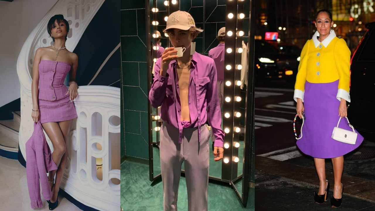 Sumptuous purples have continued to find their way into the wardrobes of celebrities enjoying this louder sense of style right now: Timothee Chalamet, not yet done with Wonka, doing some “vintaje” shopping in an open purple shirt; Meryl Streep as the stern, severely stylish Miranda Priestly in Dries Van Noten; Tracee Ellis Ross color-blocking with Barney purple and acid yellow; Pamela Anderson in a regal gown to top off her ’60s press run style.