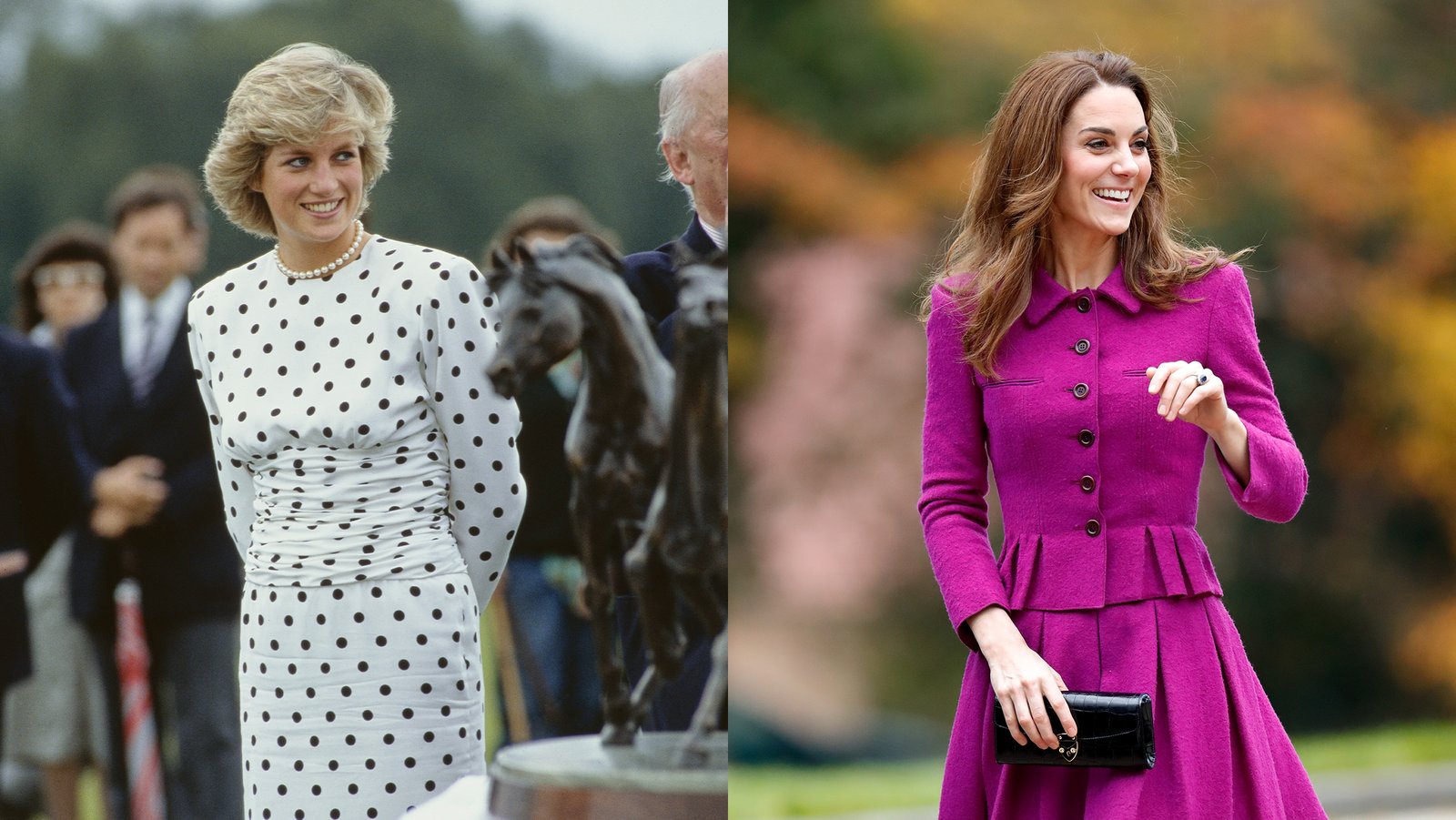 Royals and polka dots: the perfect match. She wore this dress at an equestrian event in June 1986, with a noticeable peplum detail in the back. She re-tailored the dress and removed the peplum, keeping the rest of the dress as-is, for an event in 1987.