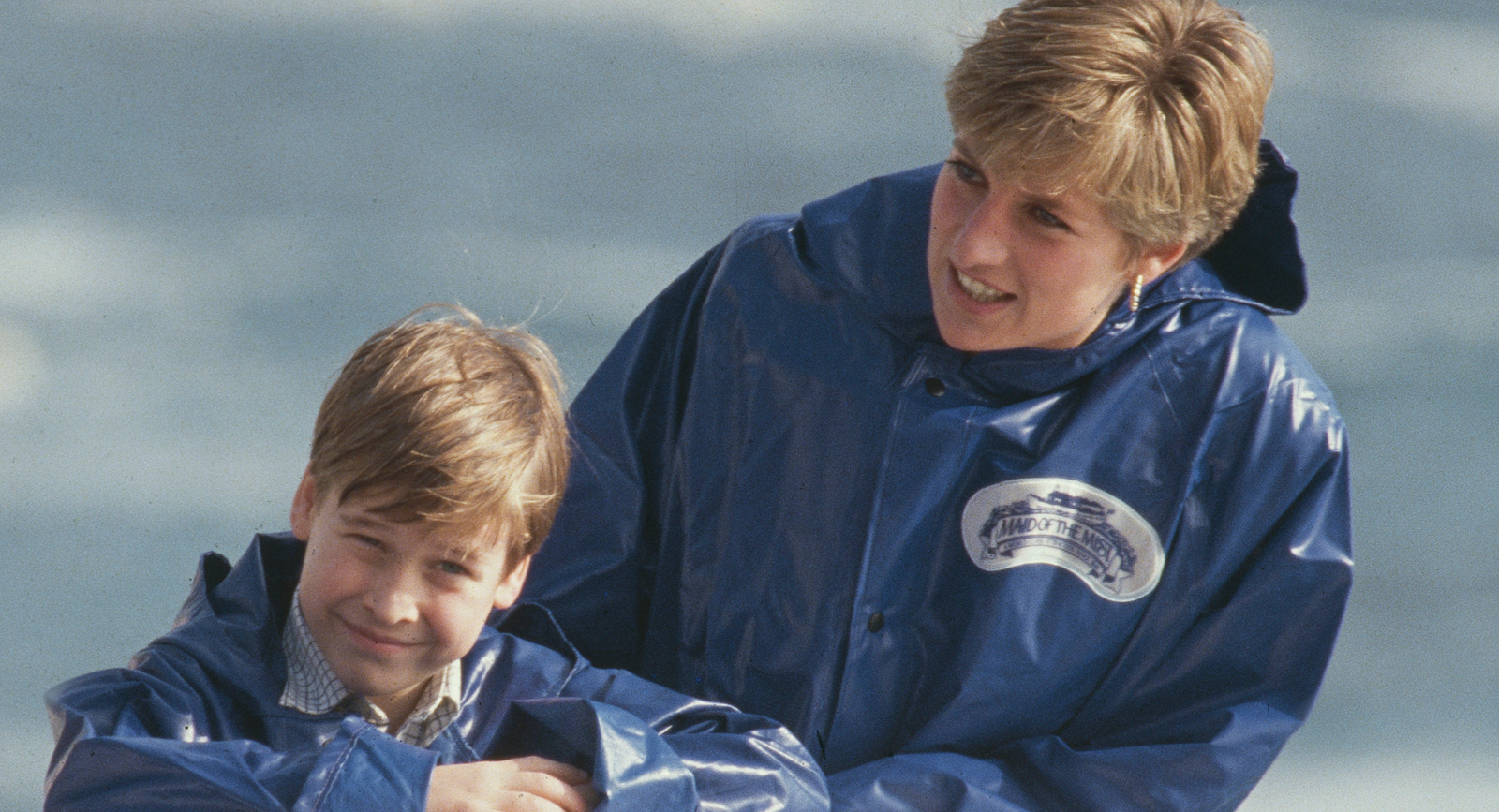 Prince William and Princess Diana both wear blue rain coats and have similar dusty blond hair