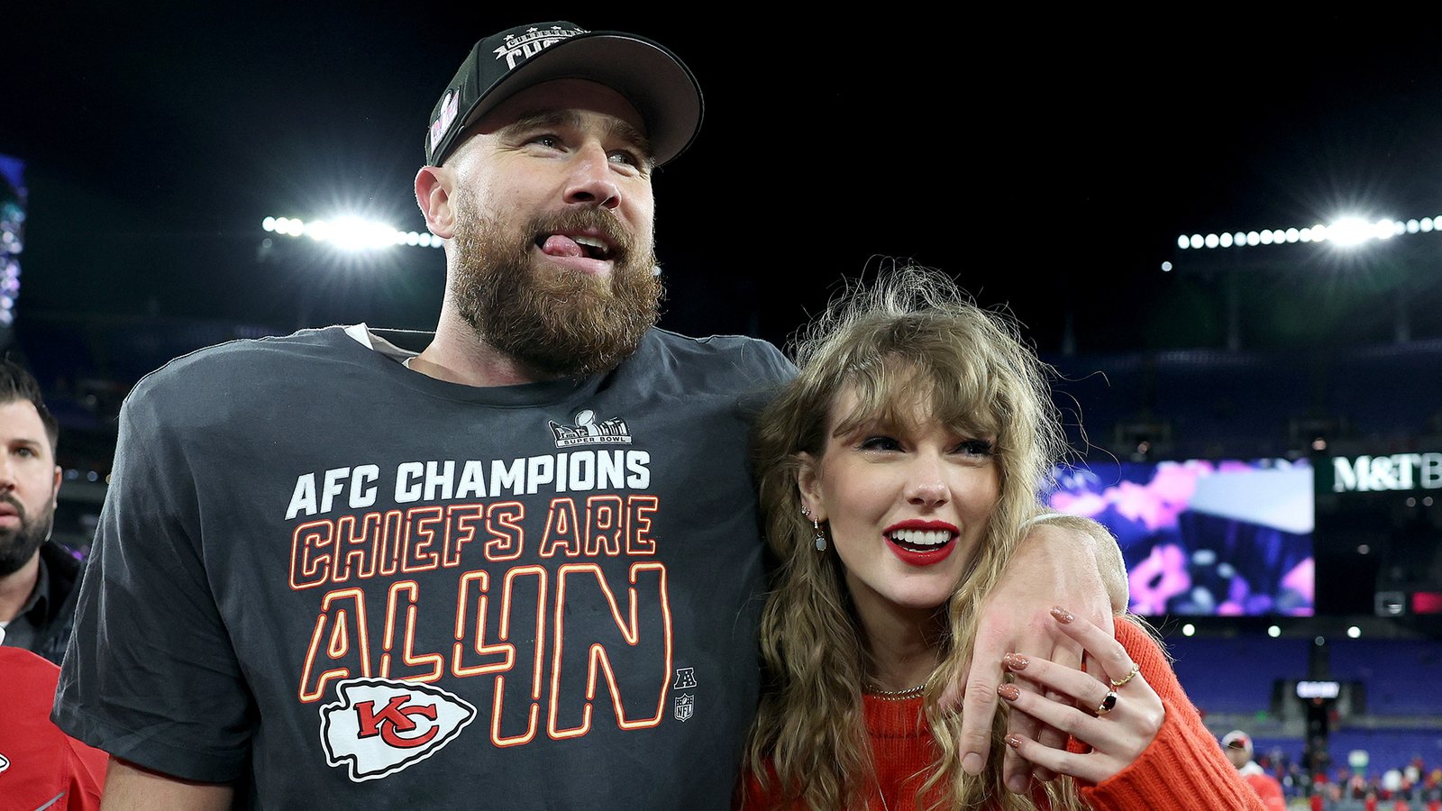 Travis Kelce of the Kansas City Chiefs celebrates with Taylor Swift after a 17-10 victory against the Baltimore Ravens in the AFC Championship Game at M&T Bank Stadium on January 28, 2024 in Baltimore, Maryland.