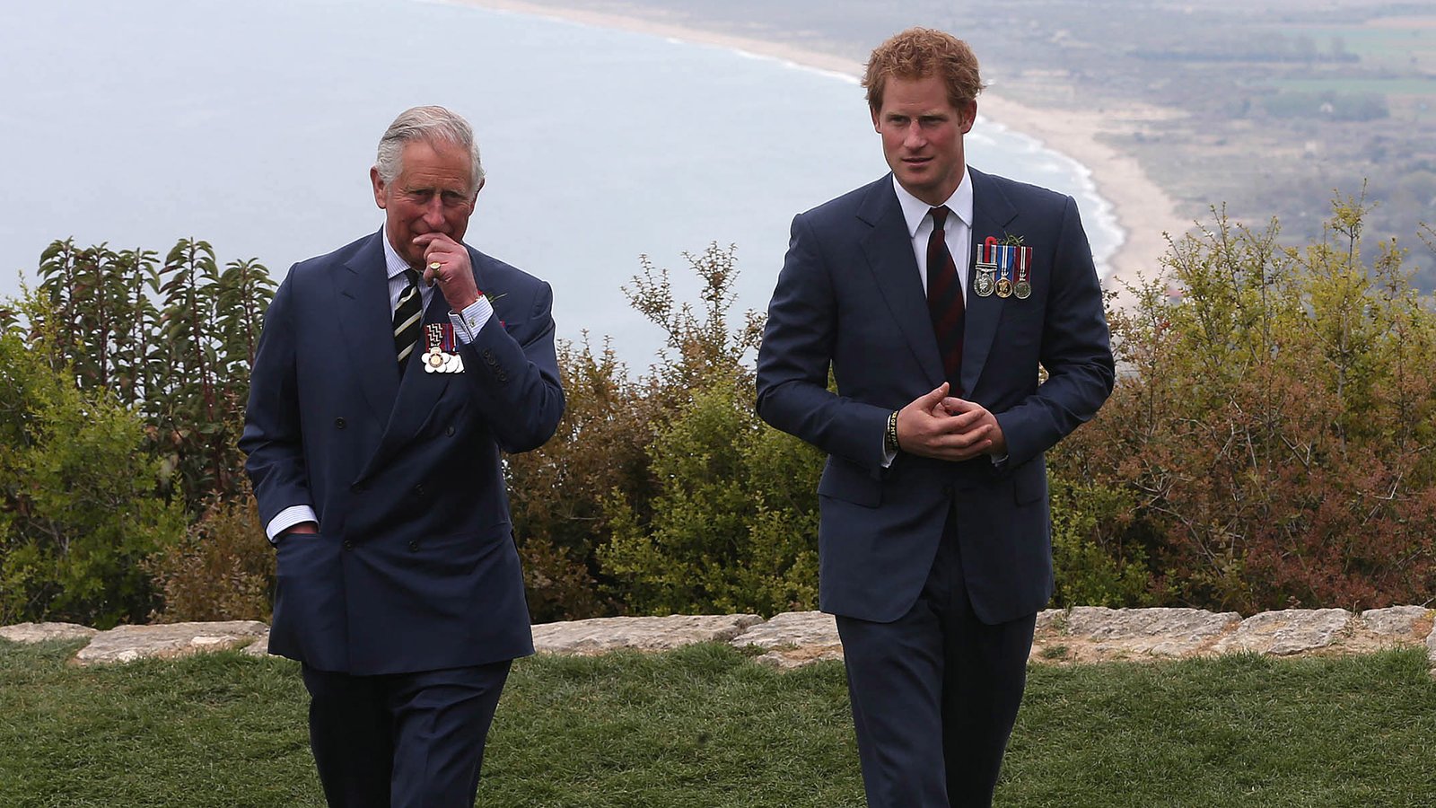 GALLIPOLI, TURKEY - APRIL 25: Prince Harry chats with Prince Charles, Prince of Wales during a visit to The Nek, a narrow stretch of ridge in the Anzac battlefield on the Gallipoli Peninsula, as part of commemorations marking the 100th anniversary of the Battle of Gallipoli on April 25, 2015 in Gallipoli,Turkey. Turkish and Allied powers representatives, as well as family members of those who served, are commemorating the 100th anniversary of the Gallipoli campaign with ceremonies at memorials across the Gallipoli Peninsula. The Gallipoli land campaign, in which a combined Allied force of British, French, Australian, New Zealand and Indian troops sought to occupy the Gallipoli Peninsula and the strategic Dardanelles Strait during World War I, began on April 25, 1915 against Turkish forces of the Ottoman Empire. The Allies, unable to advance more than a few kilometers, withdrew after eight months. The campaign cost the Allies approximately 50,000 killed and up to 200,000 wounded, the Ottomans approximately 85,000 killed and 160,000 wounded. (Photo by Niall Carson-Pool/Getty Images)