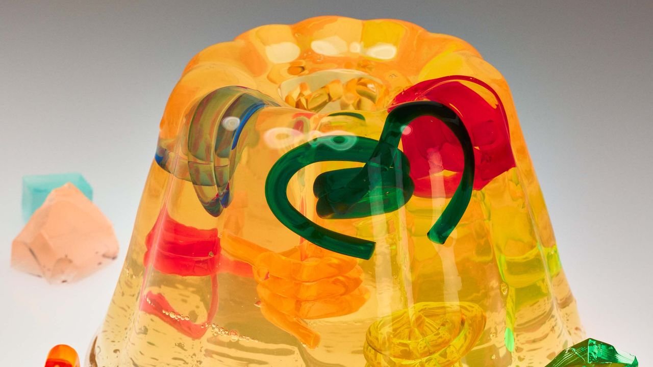 The dome-shaped gelatin has been baked with several arcylic rings by Chofa inside, a laborious, multi-hour process that involved setting the mold with several layers so the rings are suspended in a spatially pleasing way. Surrounding the mold are smaller cubes of jello in a variety of colors: highlighter yellow, radioactive waste green, and Gatorade Cool blue.