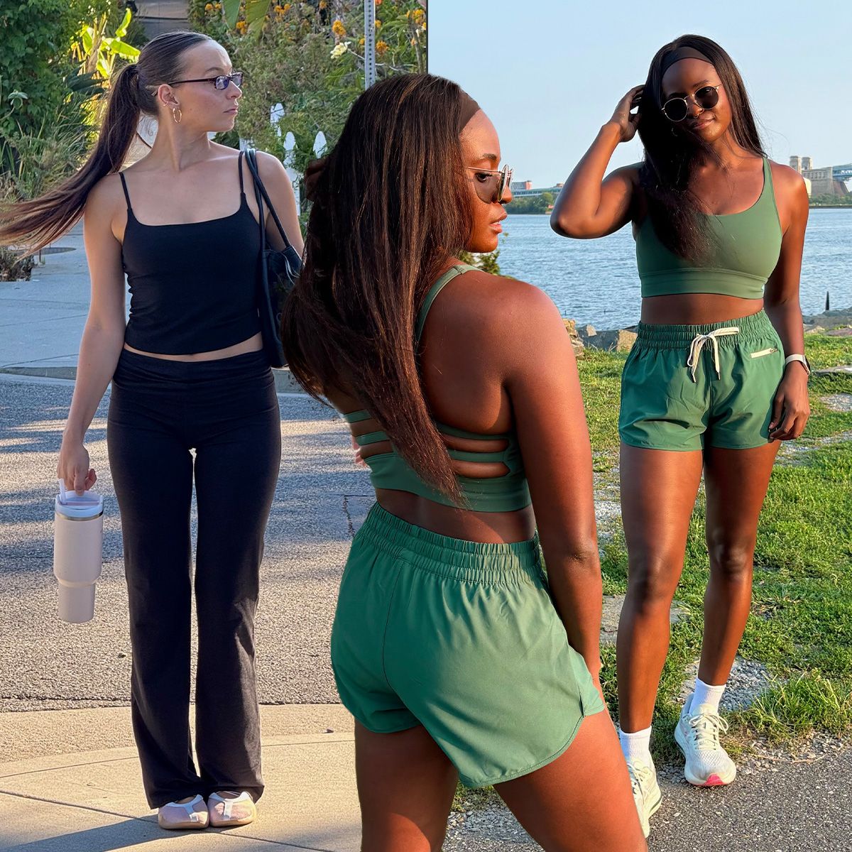 Sahara channels East Coast elegance during her golden-hour run in this bold, emerald-green set. On cooler fall days, she’ll top off the look with a lightweight jacket to shield herself from the breeze. She also loves preppy heather gray or classic navy pieces for workout classes in the city.