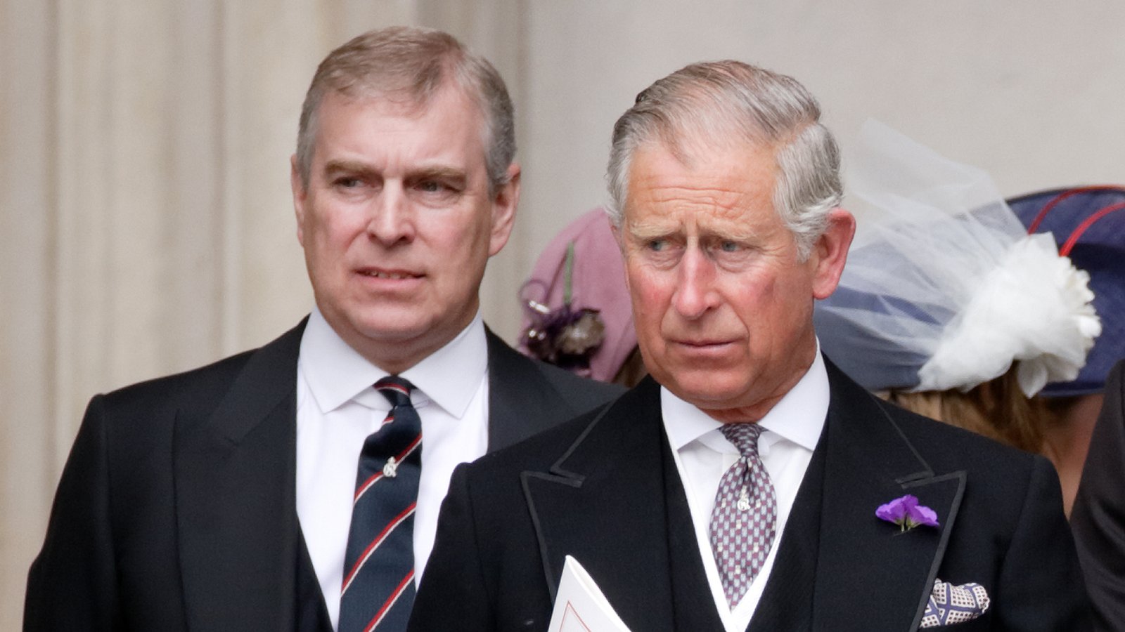 Prince Andrew wears a suit and stands behind King Charles