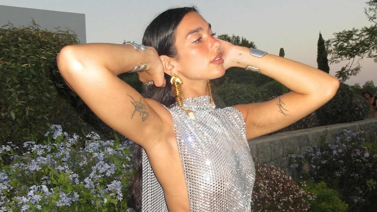The pop star’s GCDS dress by designer Giuliano Calza is reminiscent of Paris Hilton’s iconic 2002 Julien Macdonald chainmail dress, but customized specifically for Lipa. Featuring a high neckline, two side splits, and a completely open torso on both sides, the perfectly draped dress sparkles in every photograph.