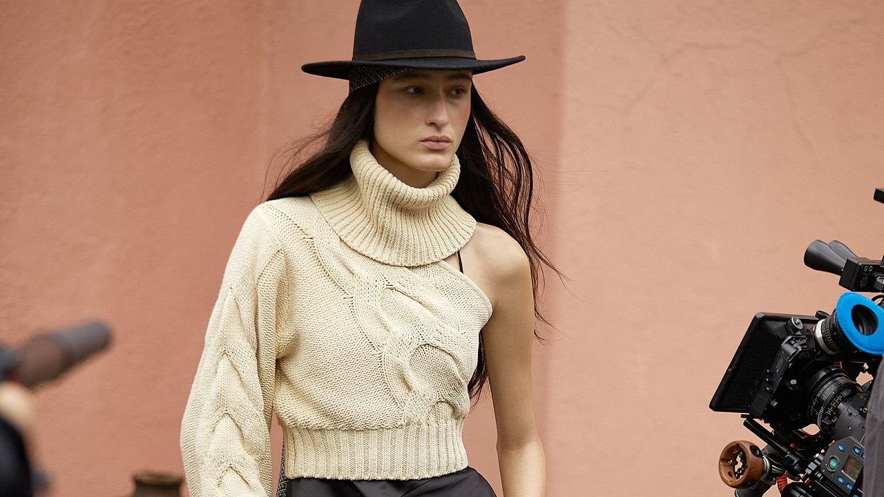 The 29-piece collection, which launches on October 16 and includes ready-to-wear, accessories, and shoes—the aforementioned cowboy boots will undoubtedly become one of the season’s It items—is not a gathering of Saravia’s greatest hits, but a distilled group of garments that immediately transmits her unique point of view. There’s sturdy denim in a sandblasted brown shade like it’s already lived through many journeys across the desert, fringed suede skirts, and intricately woven belts inspired by the petate, a mat traditionally made from palm leaves in a “V”-shaped pattern. Meanwhile, a long-sleeve tunic and a short skirt in a matching laser-cut pattern were inspired by papel picado, a traditional Mexican craft that involves intricately cut crepe paper. “I don’t have a laser cutter in my studio, so I thought, Okay, maybe they can make this [inspiration] come true for us,” the designer explained. “Being able to have this papel picado design, which is something that we really use in Mexico, was really magical.” It is one of the highlights of the offering, along with suede chaps and a handsome felt hat.