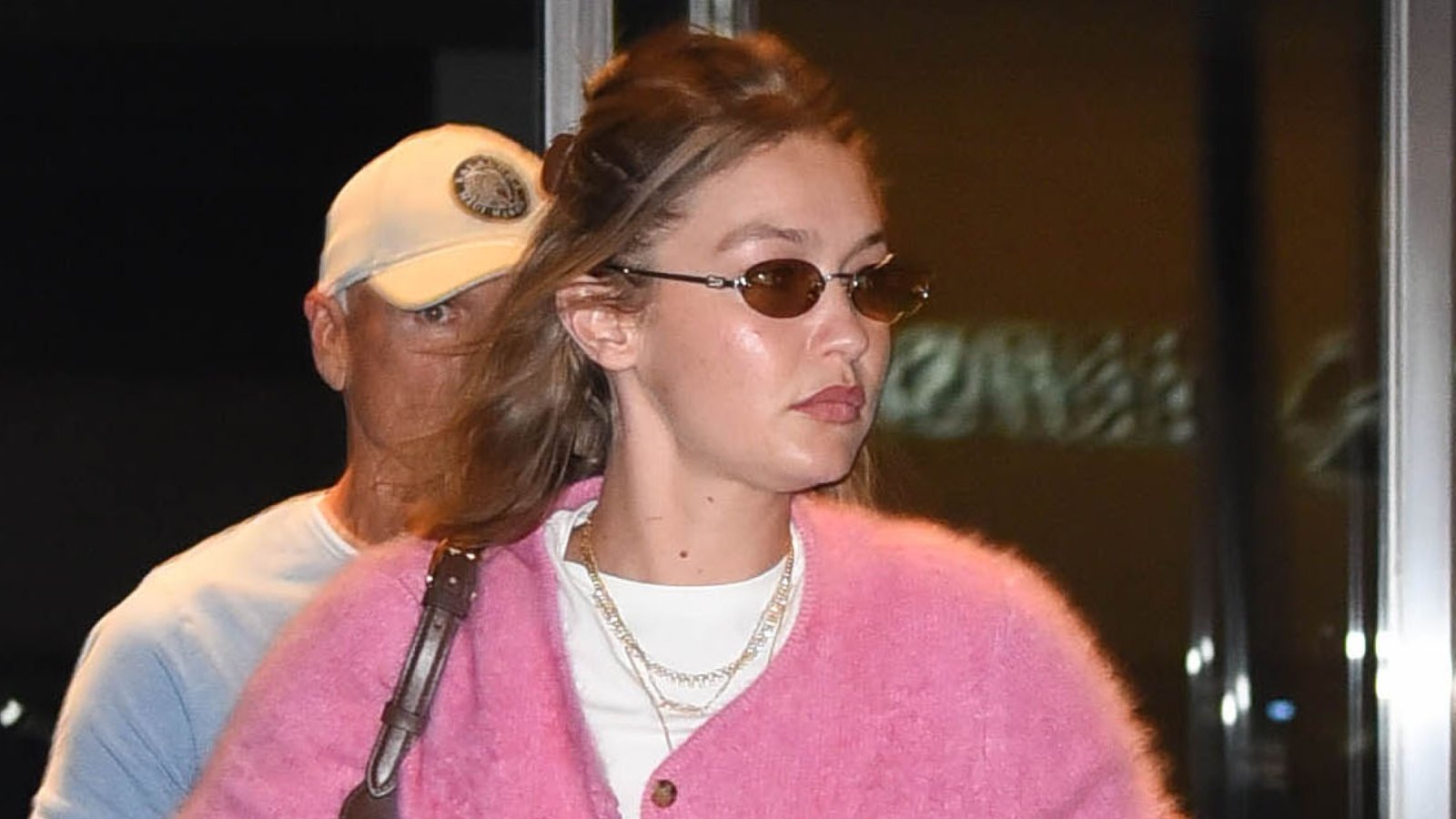 Gigi Hadid wearing a candy pink cardigan and faded wide-leg jeans.