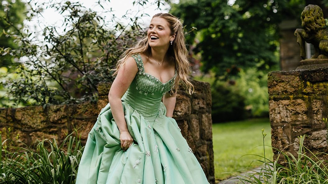 While the couple had help crafting the design for the party itself with their wedding planner, Madison tasked herself with designing her own wedding dress. This included a second look for later in the night. “I had a lot of friends whose weddings I’ve been in where they come up to me at midnight and say, ‘I have to get the hell out of this dress,’” she says. “I wanted to feel free.” A trip to Mood Fabrics with her mom helped her decide on the direction she would take. “I found this green, tattered, destroyed, embellished fabric in a bin,” she recalls. “I took it all apart and put it back into the dress.” The result was a sleeveless green gown with a beaded sweetheart neckline, a basque waist, and a full skirt complete with padded hips and a hoop.