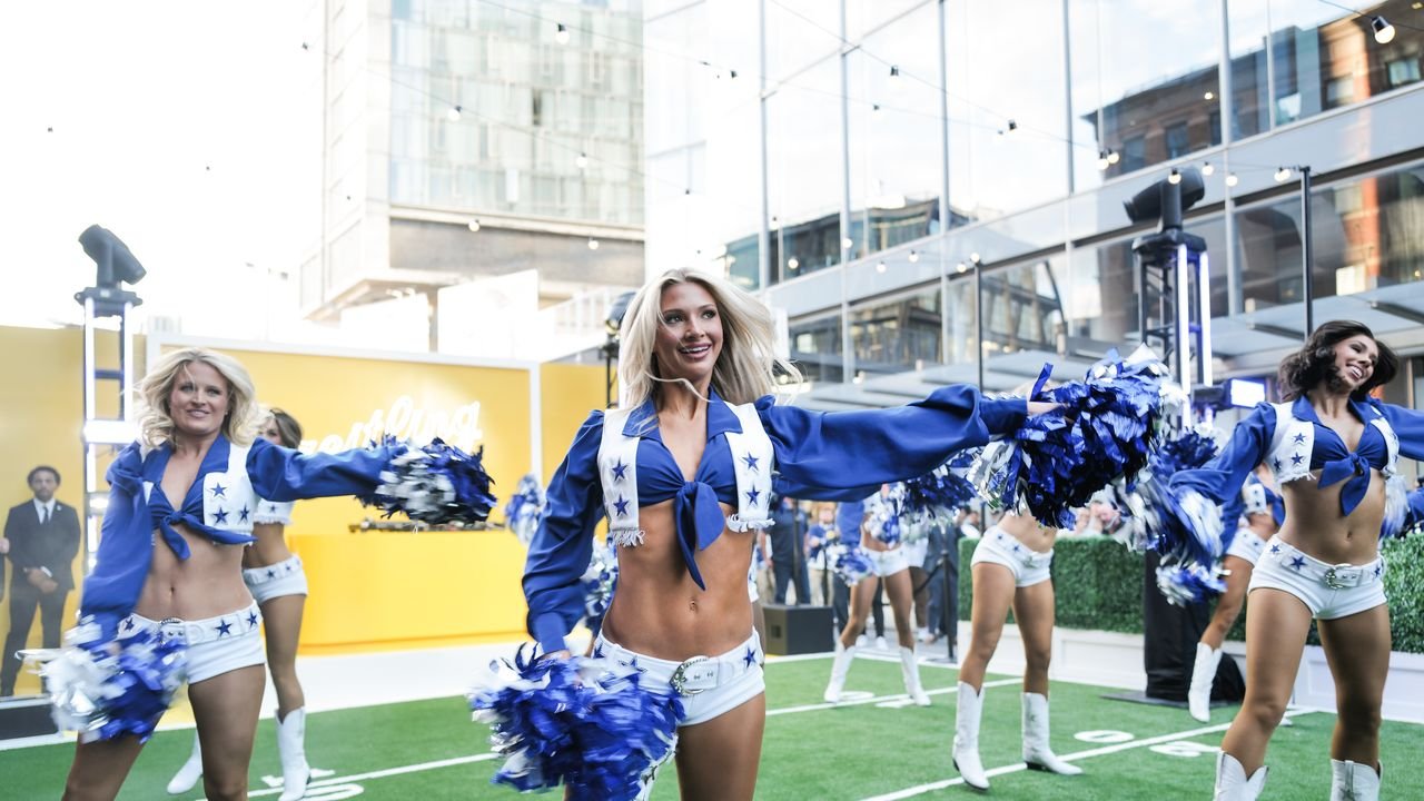 In due time, Butler emerged to much fanfare, joining NFL commissioner Roger Goodell for a moment that made hundreds of unsuspecting commuters stop in their tracks: a surprise performance by the Dallas Cowboys Cheerleaders. On the heels of their newfound stardom outside the football arena thanks to Netflix’s docuseries America’s Sweethearts, the squad stormed the stage in their on-field uniforms to do their signature routine set to AC/DC’s “Thunderstruck,” and—as a traffic jam swelled around the celebration—they closed out the evening with a flawlessly executed kick line; their white cowboy boots flying high.