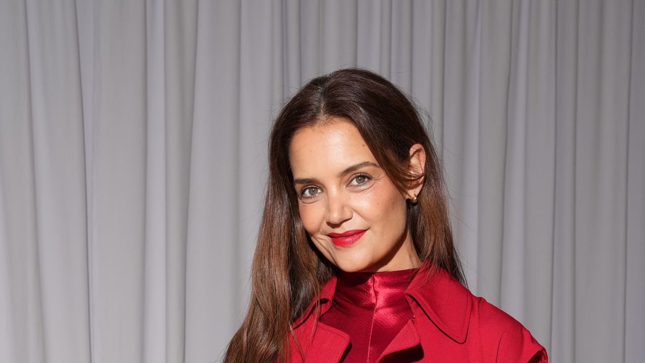 To sit front row of the spring 2026 collection show, Holmes wore a full look from the label in a brilliant strawberry red. The actor wore a sleeveless red trench style Lennox coat over the high neck, longsleeve red satin Mila dress with a drop waist and flowing skirt, and just a peep of a round toe red shoe on show. Wearing her brunette hair long and tousled, she finished her glam with rosy red cheeks and a cherry lip.
