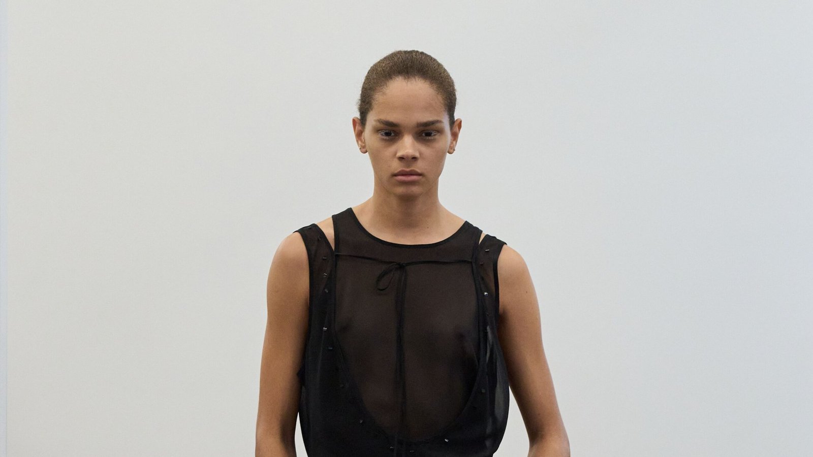 The spring 2026 Eckhaus Latta show opened with a series of all-black evening ensembles: a delicate sheer double layered tank worn with pleated trousers in a “metallicized Italian suiting” that gave it a slight wrinkled feel; a handsome three-button suit with narrow trousers in the same Italian fabric; a structured bustier worn with sheer chiffon trousers with a mini-skirt overlayer. There was also a short spaghetti strap dress embellished with studs and a banded hem that “gave away” and trailed behind as the model walked, plus a long cap sleeve dress that was revealed to be fully backless as the model walked away. It was a series of continuous gut-punches of stripped-back elegance. The opening section alone reaffirmed why the label was recently nominated for the CFDA Best Menswear Designer of the Year award.