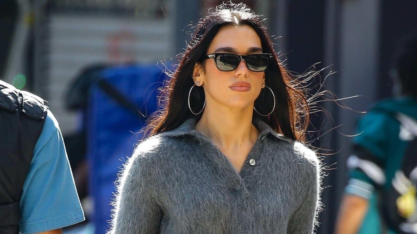 In true Lipa form, she took a few creative liberties with the original look. The model who first walked the runway in Lipa’s set, wore a matching cardigan, pearlescent white tights, and pointy ivory pumps. Lipa opted out of all of the above. She swapped the retro heels for chromatic sandals, which matched her handbag to a T. Oversize hoop earrings from Jenny Bird and paparazzi-blocking sunglasses gave Lipa’s outfit a proper Hollywood finish.