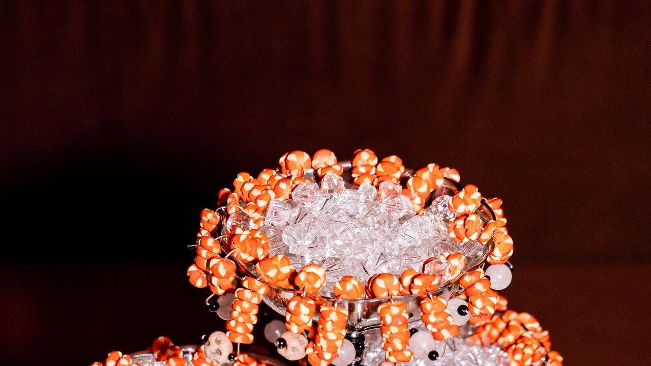 [With the beads they gave us for this event], I was like, “Well, why don’t we make it look like food?” So you’ve got the caviar corner. You’ve got little shrimp. You’ve got rock crystal ice. These cement beads look quite like butter.