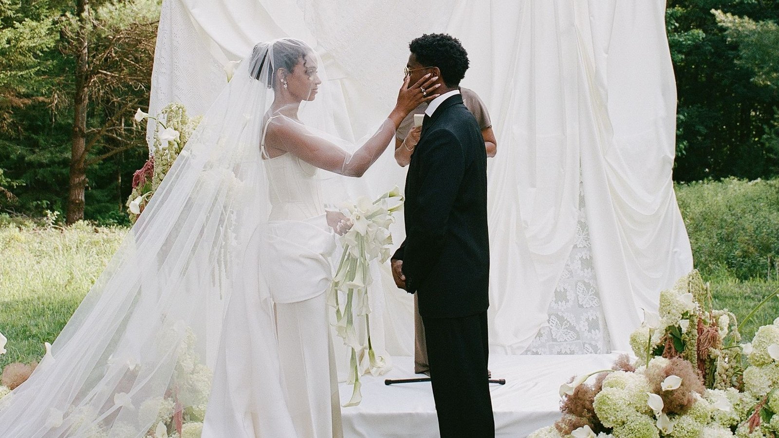 The next day, they wed in a meadow on the grounds of The Break Estate. The groom wore a Yohji Yamamoto suit and the bride wore custom Christopher John Rogers.